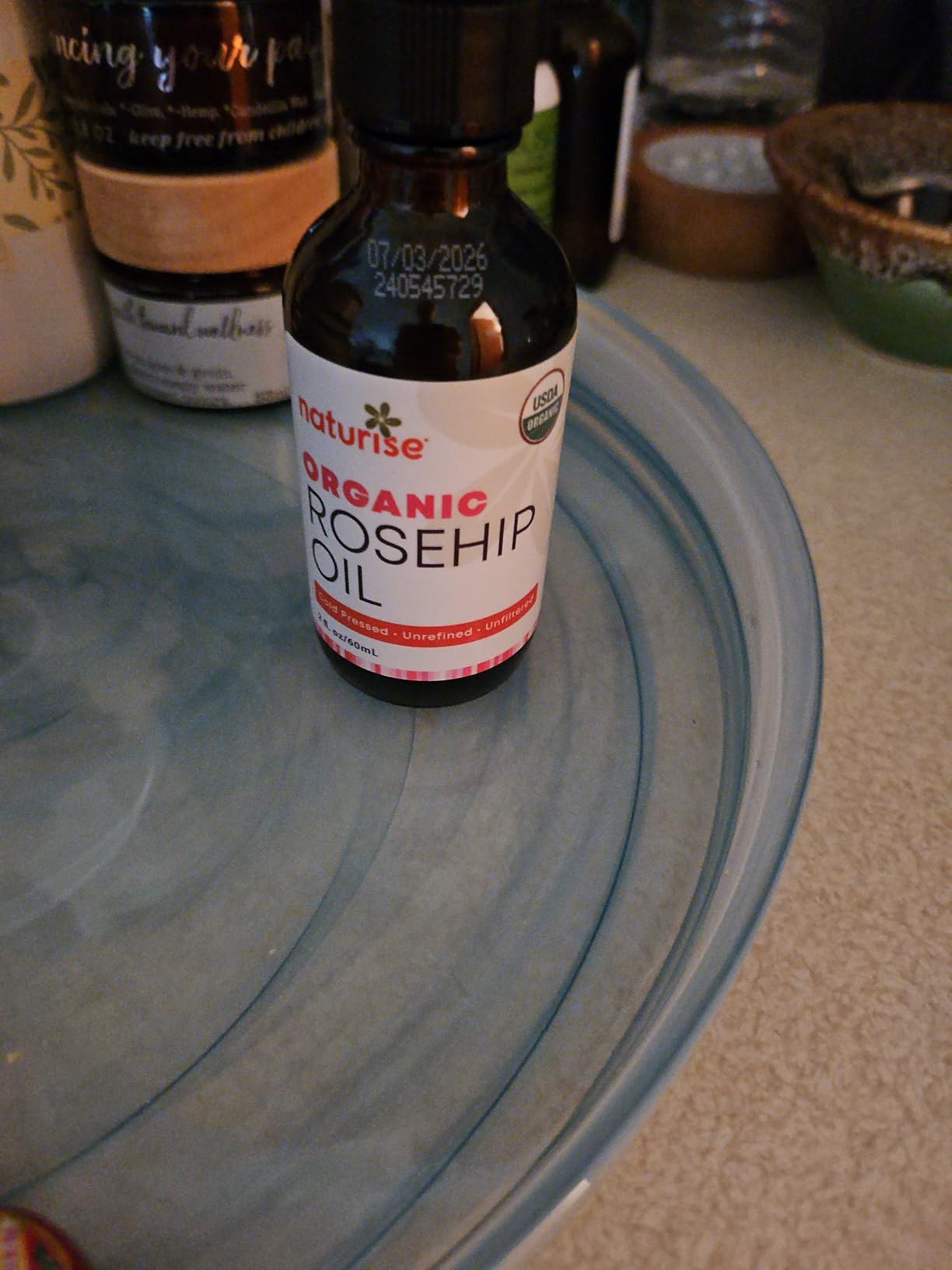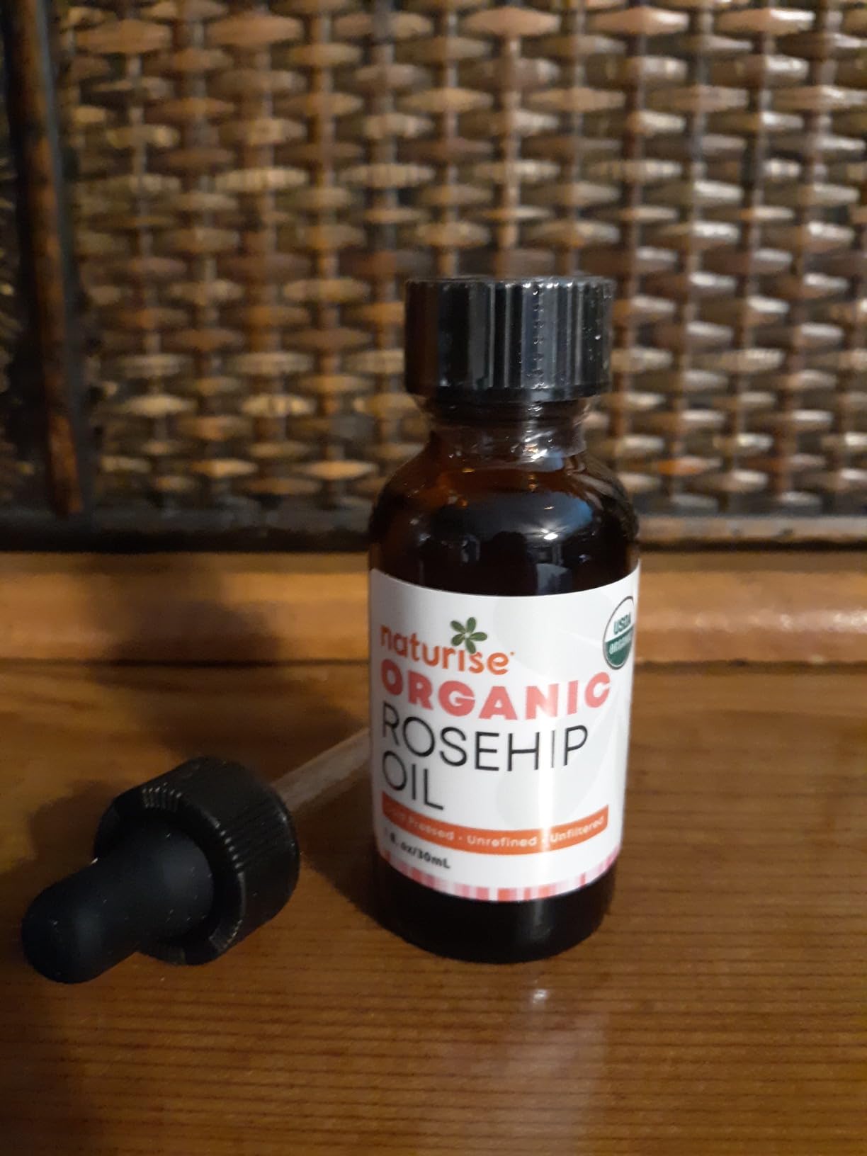 The scent is very light and earthy, so not too noticeable—I would say that if combining this oil with an essential oil, the rosehip’s scent should not interfere with the essential oil’s scent. The oil absorbed quickly into the skin without any sticky/oily feeling, so it should work well as a carrier oil. It came in an amber glass bottle with a regular lid and an eyedropper lid. The oil is USDA Certified Organic by OneCert. I did not see anywhere on the bottle to indicate where the oil was made. The expiration date (which is printed on the glass bottle itself rather than on the label) is 7/2026, so 2 years to use, although I have read that once a bottle is open the life is often shorter than a year, so I will be trying to use it all well before that expiration date!